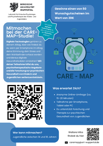 Das Forschungsprojekt CARE-MAP untersucht die Wahrnehmung mobiler Sensorik und EMA unter Eltern von Grundschulkindern (2. bis 4. Klasse) und Jugendlichen (14 bis 18 Jahre). Ziel des Projektes ist, zentrale Akzeptanzfaktoren und potenzielle Bedenken von Jugendlichen und Eltern zu identifizieren, um herauszufinden, welche Bedingungen die Nutzung mobiler Sensorik und EMA in der ambulanten Psychotherapie und Therapieforschung begünstigen.